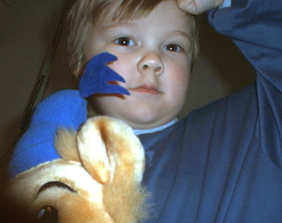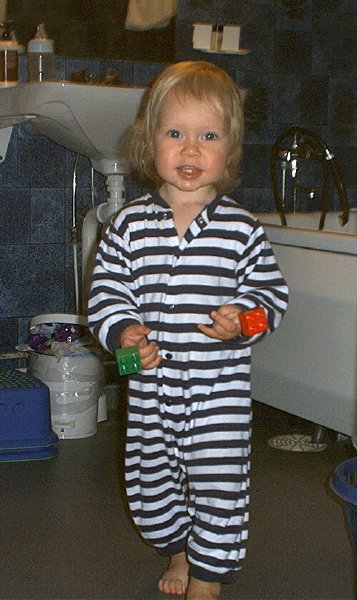 Tedde med sin Bamse-docka. Foto: Musse, 1 år. Den mörka fläcken nere i hörnet är Musses finger.