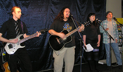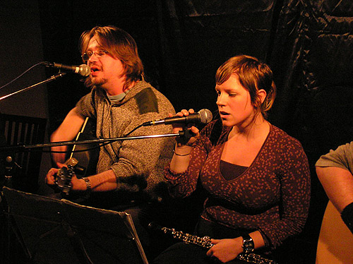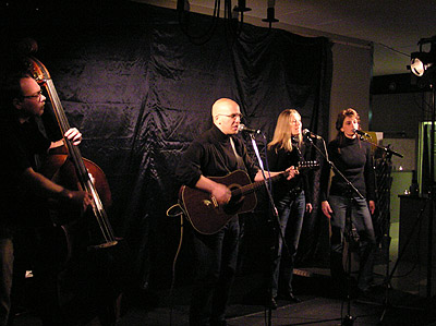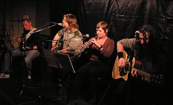 Musikaliskt var de mycket övertygande, med gitarr-gitarr-bas som grund, tre röster och en oboe ovanpå som verkligen satte pricken över i! (Maria heter hon som spelar, men efternamnet minns jag inte.) Resultatet var visrock som man både kan lättsamt gunga till eller lyssna aktivt på. Arrangemangen är välgjorda och genomtänkta, så det låter riktigt proffsigt! Det var speciellt uttalat i första låten "Djävulens pipa". Enda bristen i ljudbilden, om man ska vara petig, är att sånginsatserna någon gång lät lite vekare än de kunde varit. Det kan bero på att de satt ner. Sången var inte dålig för det, men det är den punkt som kan förbättras.