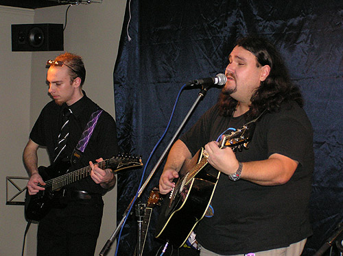 Peter svor hjälplöst över sin gitarr ett par gånger under spelningen, för den är tydligen inte i så bra skick längre. Den har ju varit trasig, och det har nog lossnat nånting. Jag drog också ner den en hel del under gång för att försöka låta Oskars gitarr ta över. Jag fick faktiskt också dra ner Peters mik, men det var av motsatt anledning! Peter har både stark röst och bra mikteknik, så han gick fram perfekt även om jag drog ner honom långt under de andra.