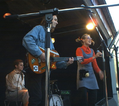 Tre eller fyra svensexor och möhippor passerade under spelningen, och två av dem bad att få dra en låt, den första i min spelning och den andra (bilden) under Humanisternas, och vi som var på scenen kompade så gott det gick. Damen ovan sjöng "Här kommer Pippi Långstrump", eller snarare nåt som vagt påminde om den. Vad killen som jag kompade "sjöng" har jag förträngt.
