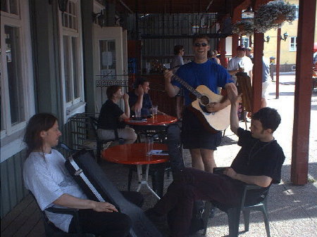 Sen körde jag min tid. Mest gamla låtar, men "Rockfestival" är ny. Vad körde jag mer? Etter-Petter, Wannabe, De lova oss en sommaräng, Den perfekta dokusåpan och ett par till. Eva sade att jag pratade för mycket mellan låtarna, och det är nog sant, för jag blev lite distraherad av att mina papper försökte blåsa bort hela tiden. Jag får väl ta ett krafttag för att lägga bort pappren. Det är dags. Anledningen att jag inte gjort det är att jag haft så mycket nytt de senaste spelningarna.