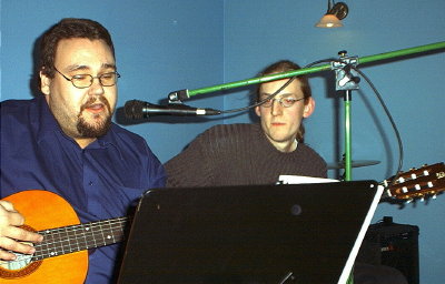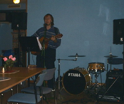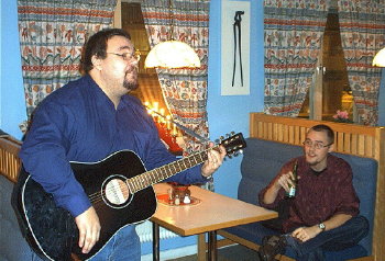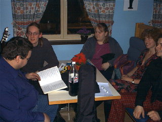 Först efter nio blev det tal om att kanske nån skulle börja spela. Jag var frivillig, så att det inte blev mer velande. Jösses vilken råddig spelning, ingen spellista, och en riktigt usel engångssång för dagen, men det var kul i alla fall. Några av "hitsen" satt rätt bra i alla fall. Engångssången hade väl några rader som var minnesvärda. Peter tog en bild, så jag kom med alls!