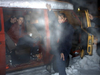 Jag var lite snål med bilder på Trygg och Everhill, men det tar jag igen här. Lite extra mycket bilder på turnébuss alltså. Hanna förevisar stolt turnébussen, men en lustig dimeffekt gjorde bilden lite mer speciell än det var meningen.