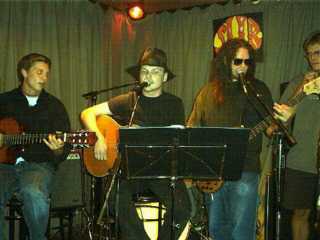Peter Frisk var värd, presenterade banden och spelade egna låtar mellan varven. Han inledde med den låten som Olofsman kallat hans "signatur", som heter... äsch, påminn mig, nån. Ni vet, den med "jag säger upp mig själv och blir dansk".