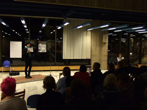 Lyrikföreningen Dödsstjärnan hade poesislam på samma plats där dansarna ovan var innan. Vi ser Martin borta till höger.