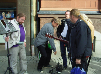 Första målet var att få höra Blå Häst spela på spårvagn. Vi fick i alla fall möta dem på gatan innan och byta några ord med Pentti, men plats på spårvagnen fanns det inte alls. Det var ju fika-spårvagn, så den var full med folk som fikade redan när den kom! Deras stora kvällsspelning var för sent för barnen, så där missade vi dem också! Miss nummer ett.