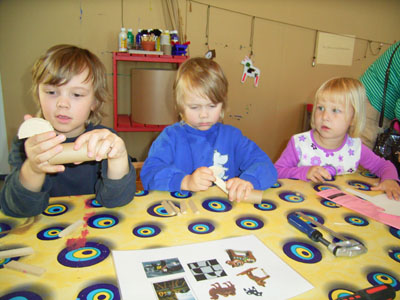 Sedan blev det pyssel. Tedde och Musse håller på med var sin häst. Katja ser på.