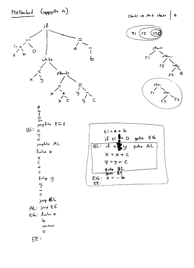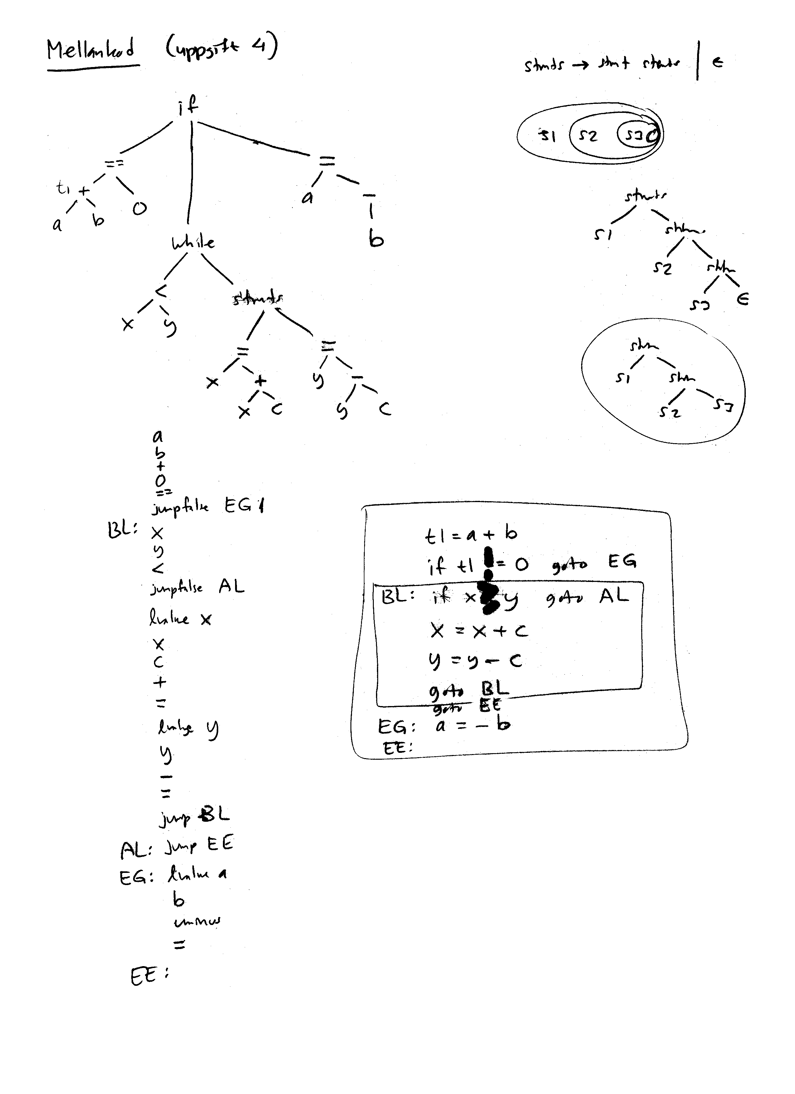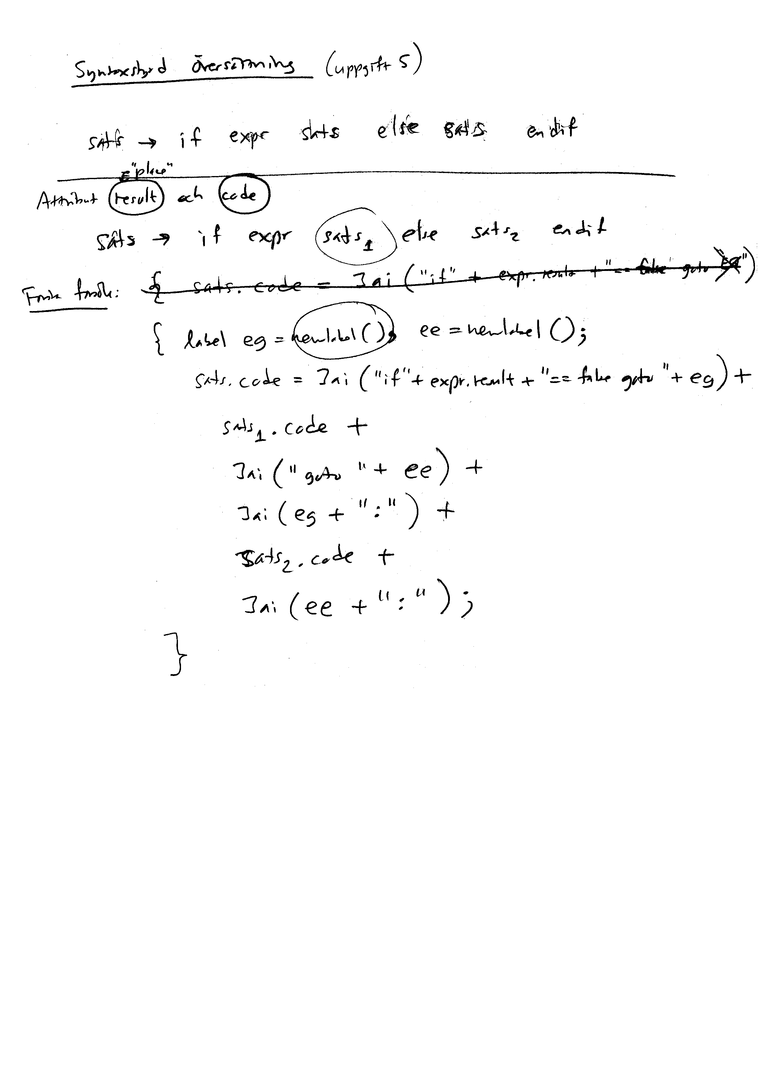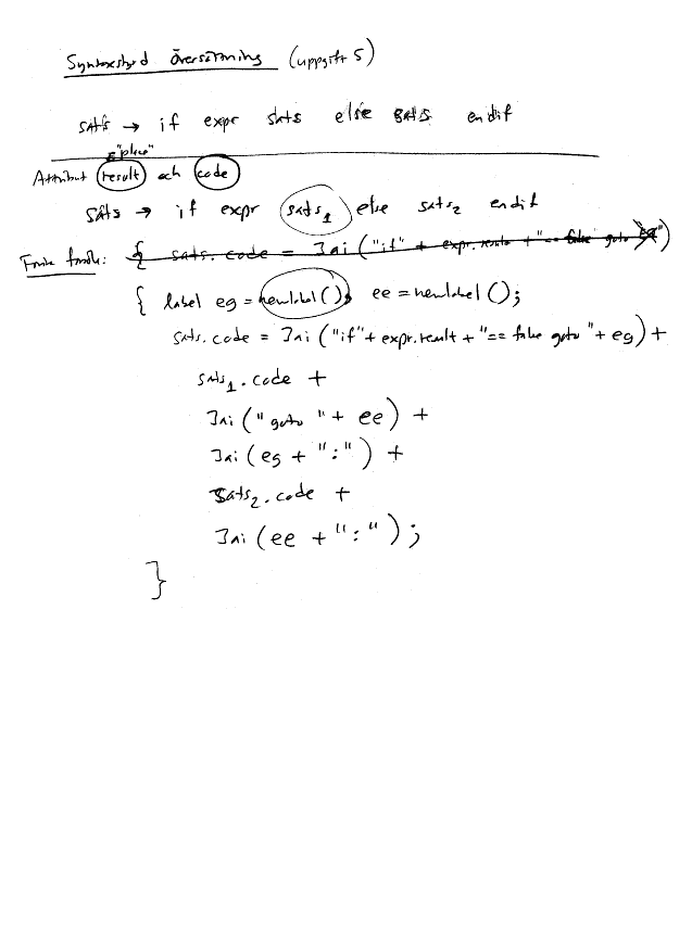 Skapa ett syntaxstyrt översättningsschema, med produktioner och semantiska regler, för översättning av if-satsen till treadresskod. Antag att översättningsschemat ska implementeras i bottom-up-parsningmiljö med en stack, som i Yacc och Bison. Utgå från din grammatikregel ovan, som dock kanske måste modifieras. Förklara införda attribut och eventuella funktioner och instruktioner som används. Ange alla dina antaganden.