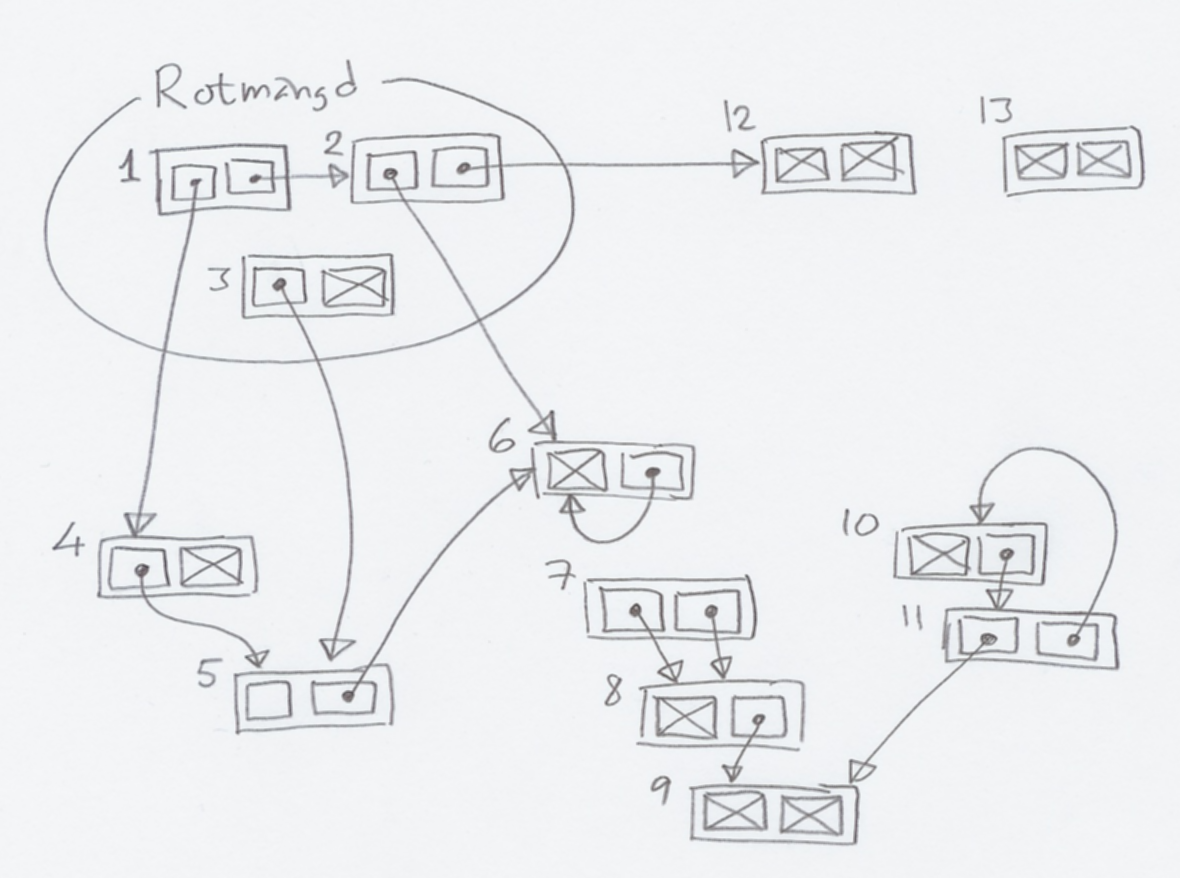 c) Antag att vi i stället använder referensräkning. Kan situationen som visas på bilden uppstå? (Vi antar att vi inte är mitt i en uppstädning.) Motivera svaret.