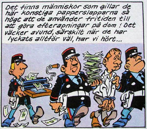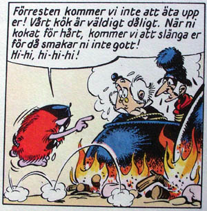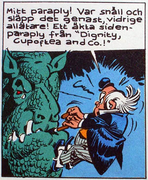 Bara dessa två sidor gör albumet värt besväret, och resten är också bra. Sagovarelserna möter både frågan om vad pengar är för något, griniga portvakter, militärer och stridsvagnar, och förvirring och roliga situationer uppstår, ständigt buret av reaktionerna på vår kultur från ett skönt naivt men samtidigt mycket ironiskt perspektiv. Lysande!