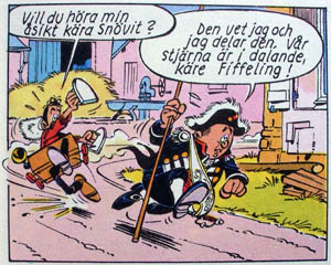 Så långt har vi bara en barnslig värld där invånarna med all säkerhet är barnsligare än läsaren. Kan man få detta att fungera för en albumserie? Ja, om man spelar på kontrasten mellan verkligheten och sagovärlden, och det är också just där serien är som bäst.