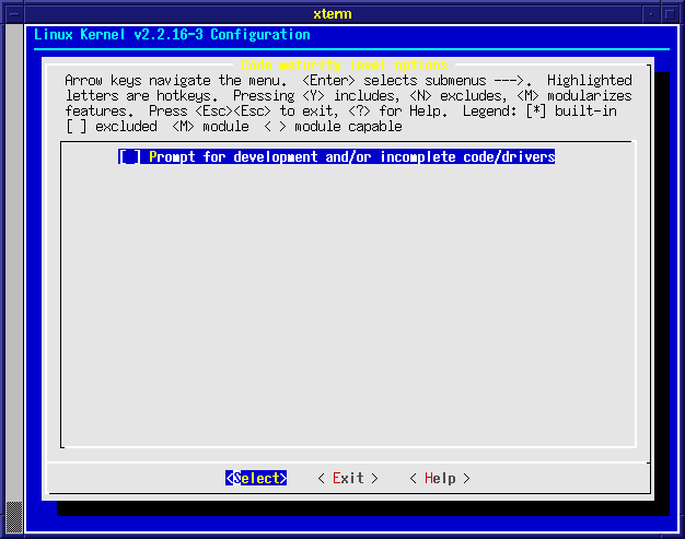 Det första som ska göras är att konfigurera kärnan och tala om vad som ska finnas med i kärnan. Starta konfigureringen medmake menuconfigeller om du kör i fönstermiljö (X-window System) och vill köra konfigurationen i ett separat fönster